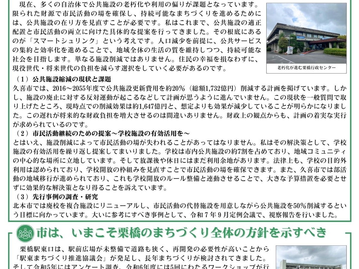 最新の活動報告書が完成しました。 今回も公共施設の縮減に関する提案を中心に、地域の皆さんからいただいた声をもとに議会で取り上げたテーマ(部活動の地域移行・南栗橋の公共交通)や、その進捗状況をまとめています。ぜひご覧ください。 今回、記事で扱った事業はいずれも国や県の方針に基づき、久喜市が地域特性を反映して計...