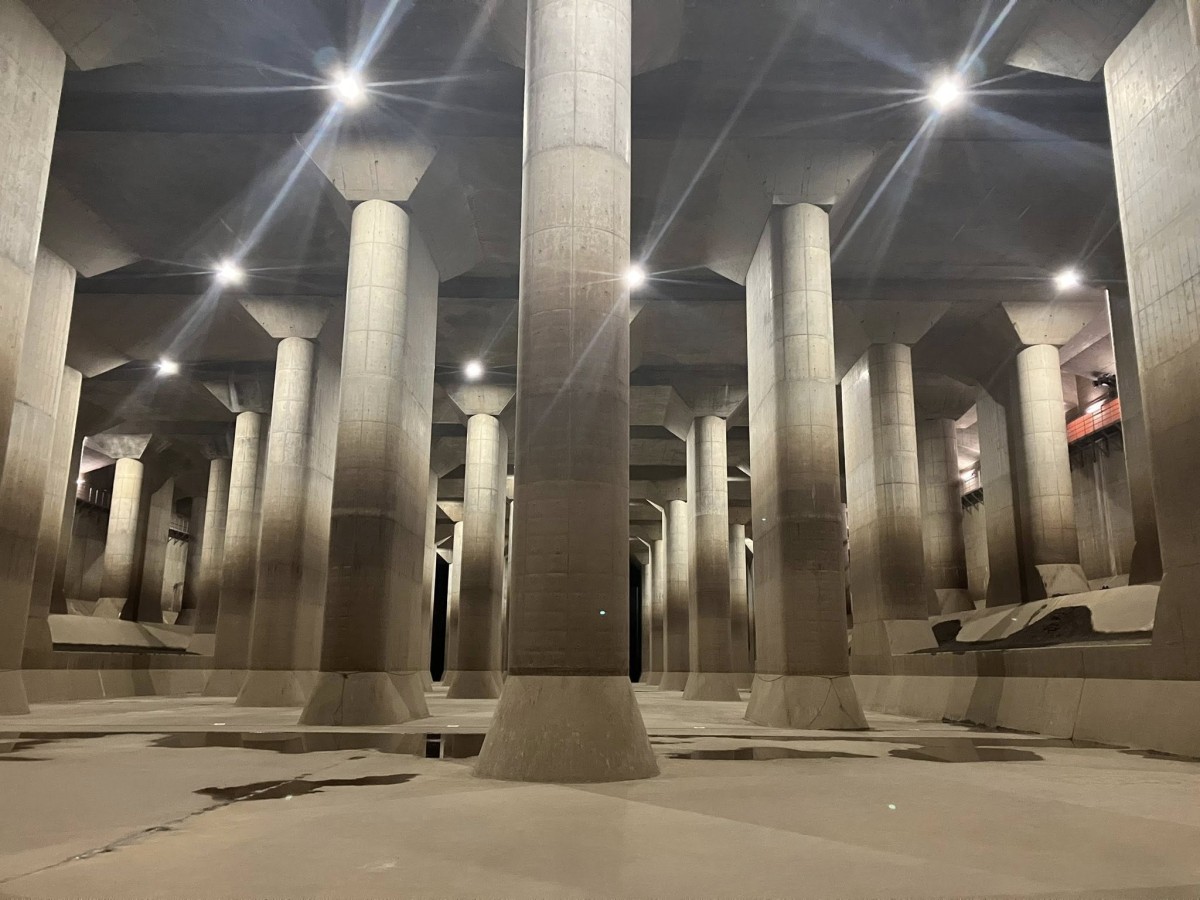 地下50mに広がる巨大放水トンネル(貯水容量67万㎥)。中小河川の洪水を江戸川へ逃がす全国最大級の治水施設で、これまで150回以上運用され、越谷・春日部など流域の浸水被害を大幅に減らしています。