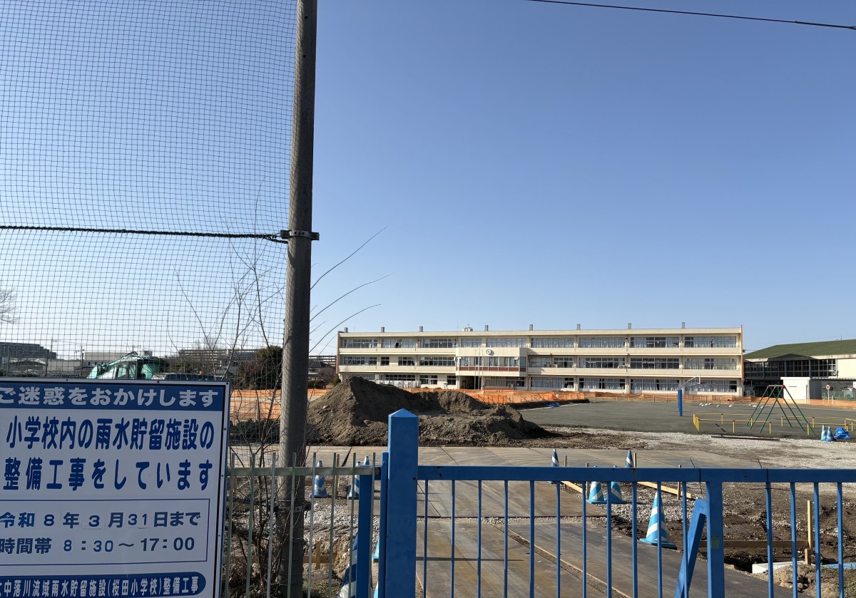 現在、鷲宮地区の桜田小学校では、校庭を活用した「大中落川流域雨水貯留施設整備事業」が進められています。