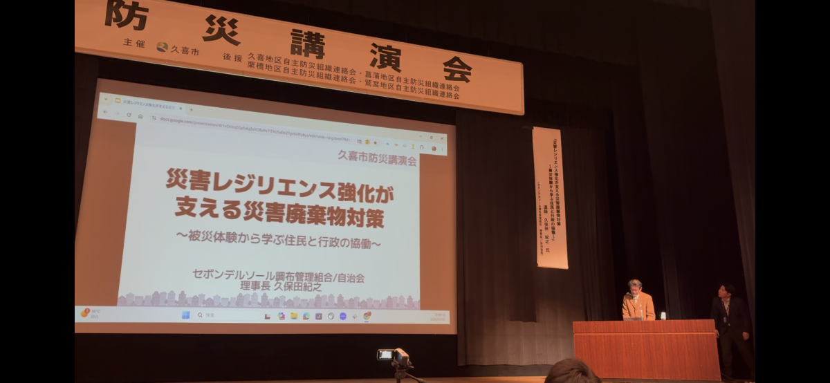 「災害レジリエンス強化が支える災害廃棄物対策」と題した講演では、久保田さんが自治会長を務める集合住宅の地下が浸水した当時の状況から、復旧・復興の過程で大きな課題となった「災害廃棄物」の問題への対応まで、約70分にわたり具体的なお話をいただきました。