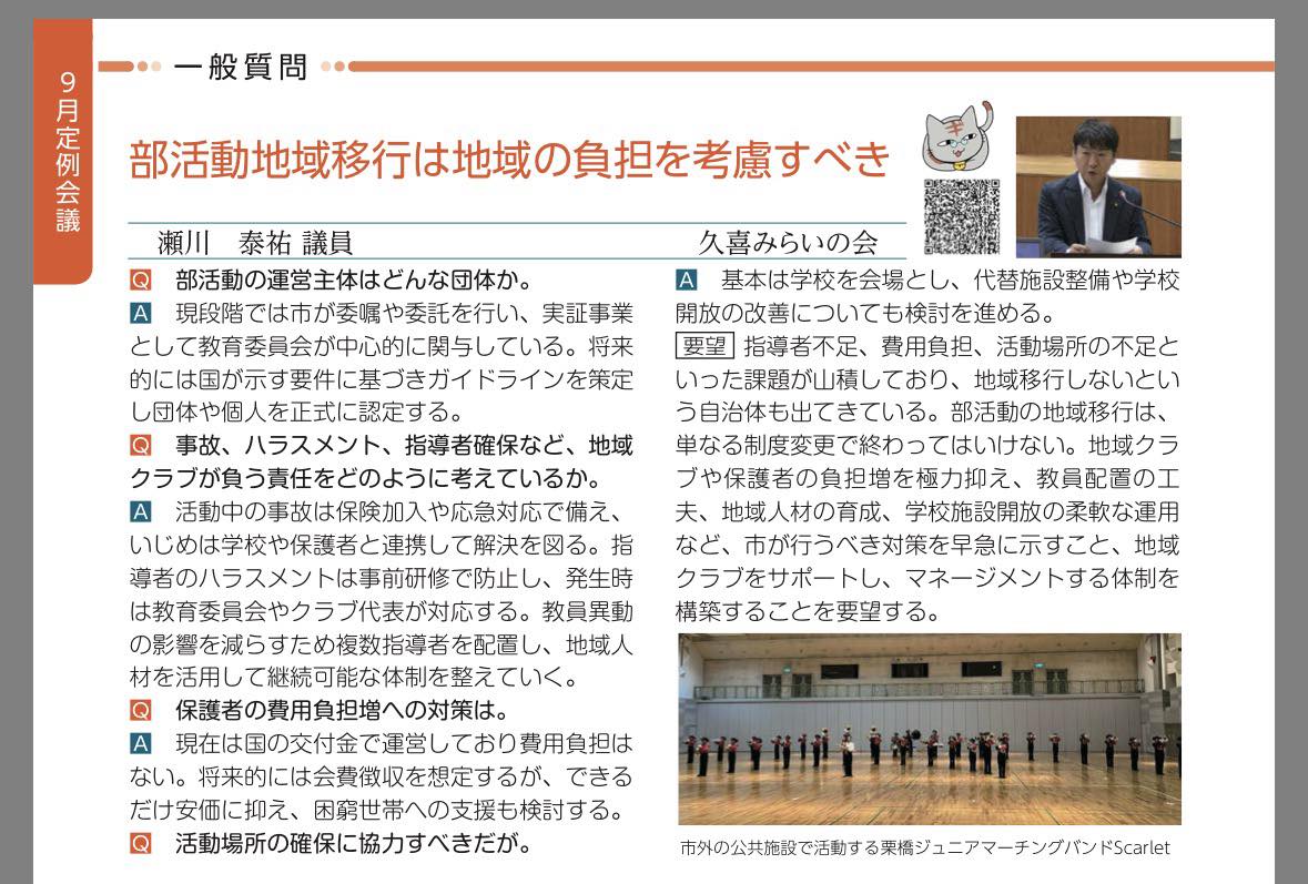 市議会だよりが発行されました。 今回は一般質問で取り上げた項目の中から、部活動の地域移行について書いてみました。 ここ数年、スポーツクラブの運営を通じて、指導者確保の難しさは肌で感じてきました。子どもの成長過程に関わる以上、指導者の質(専門性はもちろん、教育的側面も求められます)も保たねばなりません。公共施...