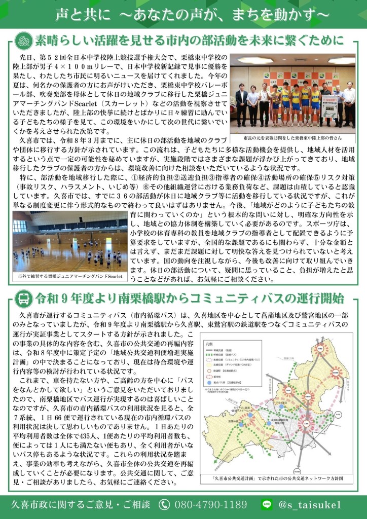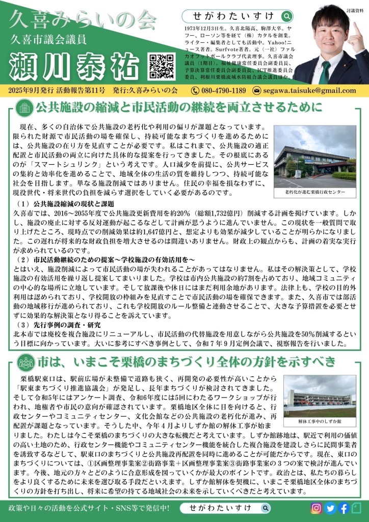 今回も公共施設の縮減に関する提案を中心に、地域の皆さんからいただいた声をもとに議会で取り上げたテーマ(部活動の地域移行・南栗橋の公共交通)や、その進捗状況をまとめています。ぜひご覧ください。