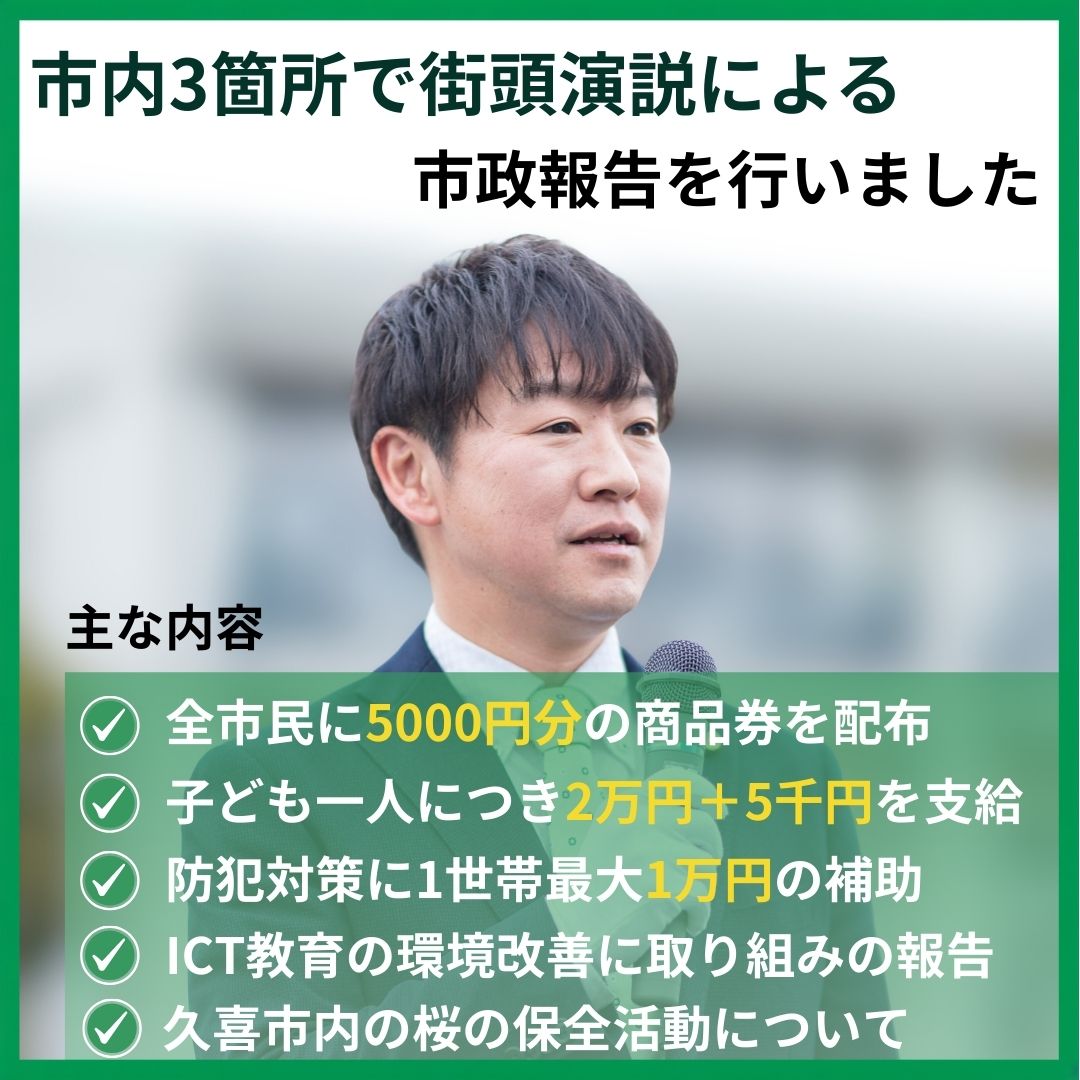 今日は、市内3箇所で街頭演説を行い、先日閉会した11月定例会議の議会報告、そして現在取り組んでいる市政課題のうち2点を説明させていただきました。