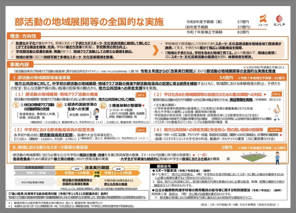 文部科学省より、令和7年12月に部活動の地域展開に関するガイドラインが公表され、認定制度や補助・負担の考え方が明らかになりました。整理を兼ねて投稿します。