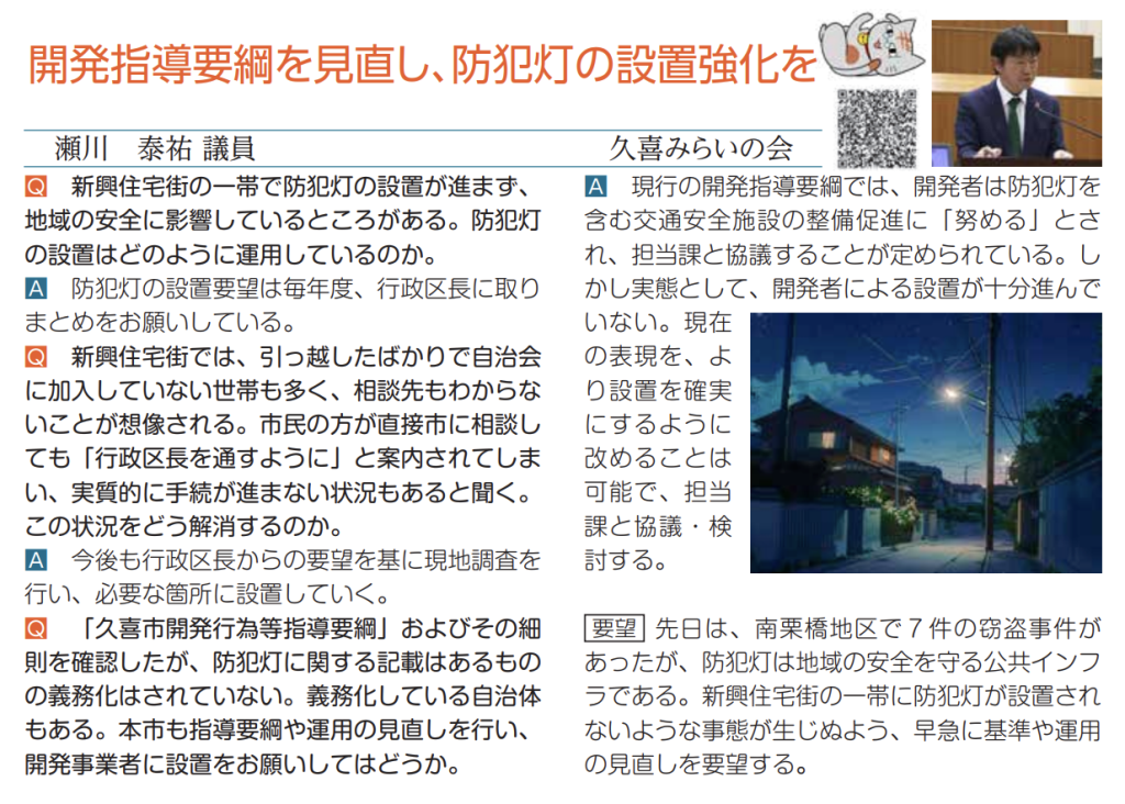 こうした問題意識から、久喜市の防犯灯設置に関する行政サービスの提供ルールに課題があることを議会で問題提起しました。また、他自治体の事例も参考にしながら、解決策として開発指導要綱の見直しを提案しました。担当課の職員の皆さんや、当該地区の区長さんとも丁寧に意見交換を重ねた結果、関係者の理解を得た上で、来年度から防犯灯設置が進むこととなりました。