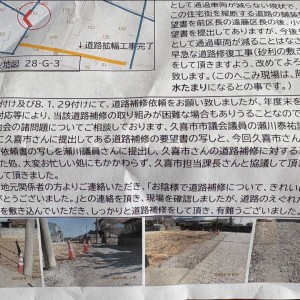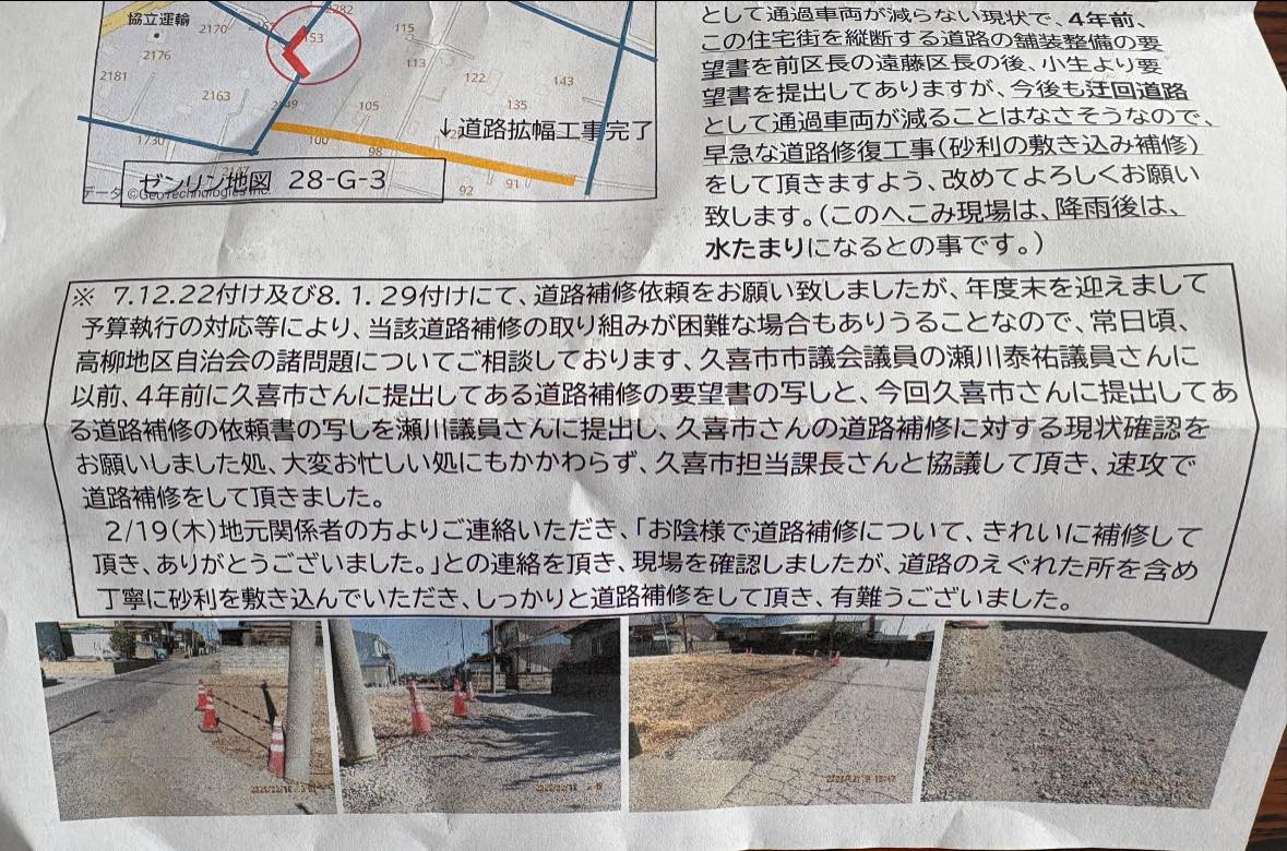地元の区長さんから道路修繕の相談を受け、久喜市にお願いしていた道路補修対応が終わり、対応完了の報告書をいただきました。